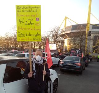 Am 2. März 2021 legten große Teile der Frühschicht von Conti-vitesco in Dortmund von 6 - 10 Ur die Arbeit nieder. 150 Kolleginnen und Kollegen von verschiedensten Betrieben kam zur Warnstreik-Autokundgebung auf einen Parkplatz am Signal-Iduna-Park. Sie setzten damit ein Zeichen gegen die Provokation von Gesamtmetall, den Arbeiterinnen und Arbeitern für die nächsten 1,5 Jahre eine Nullrunde zu verordnen. Wir fordern 4 % mehr Lohn - ohne Abstriche! Kein Verzicht! Für Arbeitszeitverkürzung bei vollem Lohnausgleich! Hier ein Bericht auf www.rf-news.de.